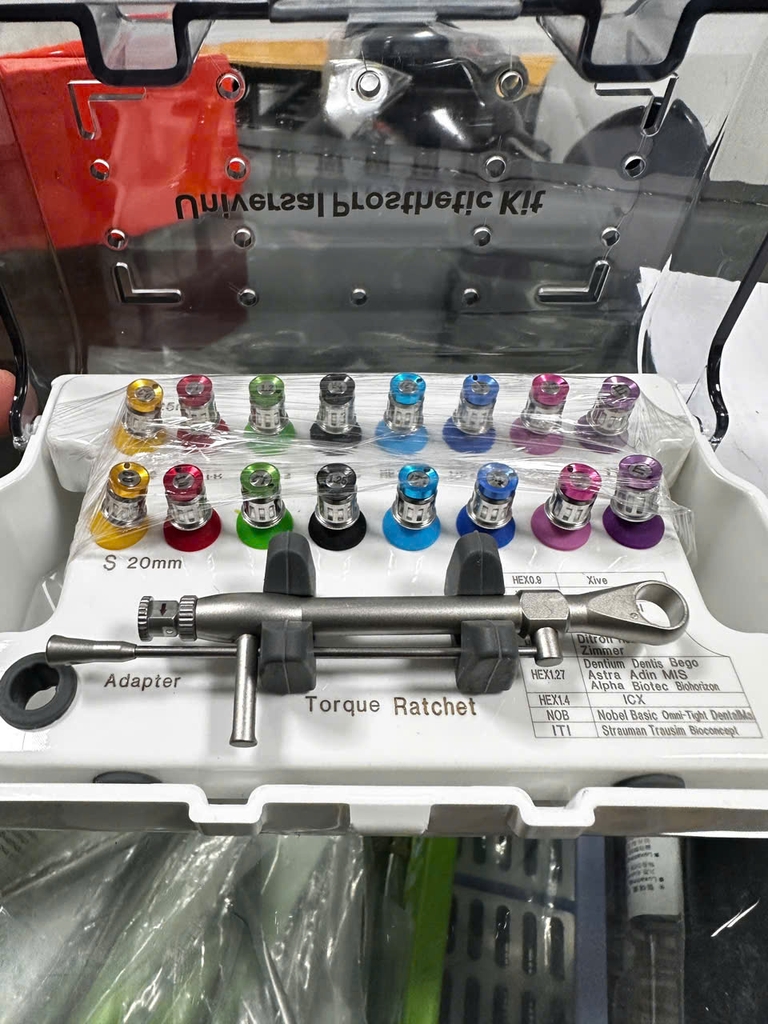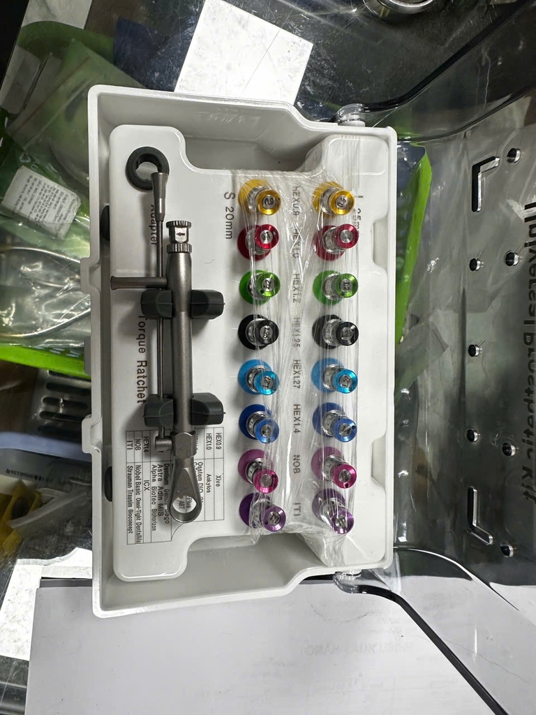 Bộ bao gồm một bộ hoàn chỉnh để siết vít lâm sàng và vít phục hình đến giá trị mô-men xoắn chính xác.