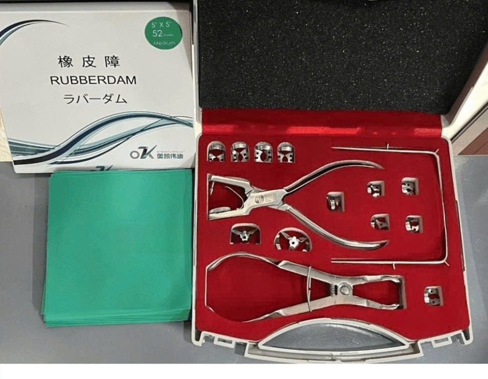 Bộ Đặt Đê Cao Su (Rubber Dam Kit) gồm đầy đủ dụng cụ cần thiết để cô lập vùng làm việc, giúp bác sĩ thao tác dễ dàng, chính xác và đảm bảo vô khuẩn tuyệt đối trong điều trị.