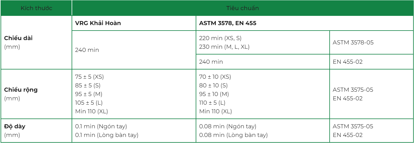 Tiêu chuẩn chất lượng: phù hợp với các tiêu chuẩn ASTM D3578 và EN455. Sản xuất theo hệ thống quản lý chất lượng ISO 13485:2016; ISO 22000:2018; ISO 9001:2015; SA 8000:2014.Kích thước: Extra-small; Small; Medium; Large; Extra-large
